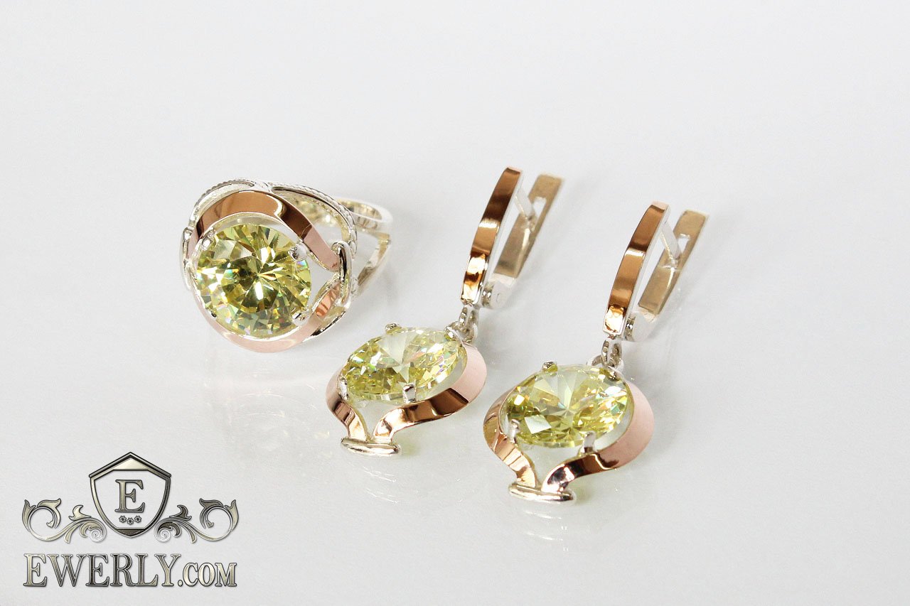 Жіночий комплект: срібний перстень і сережки з жовтими каменями