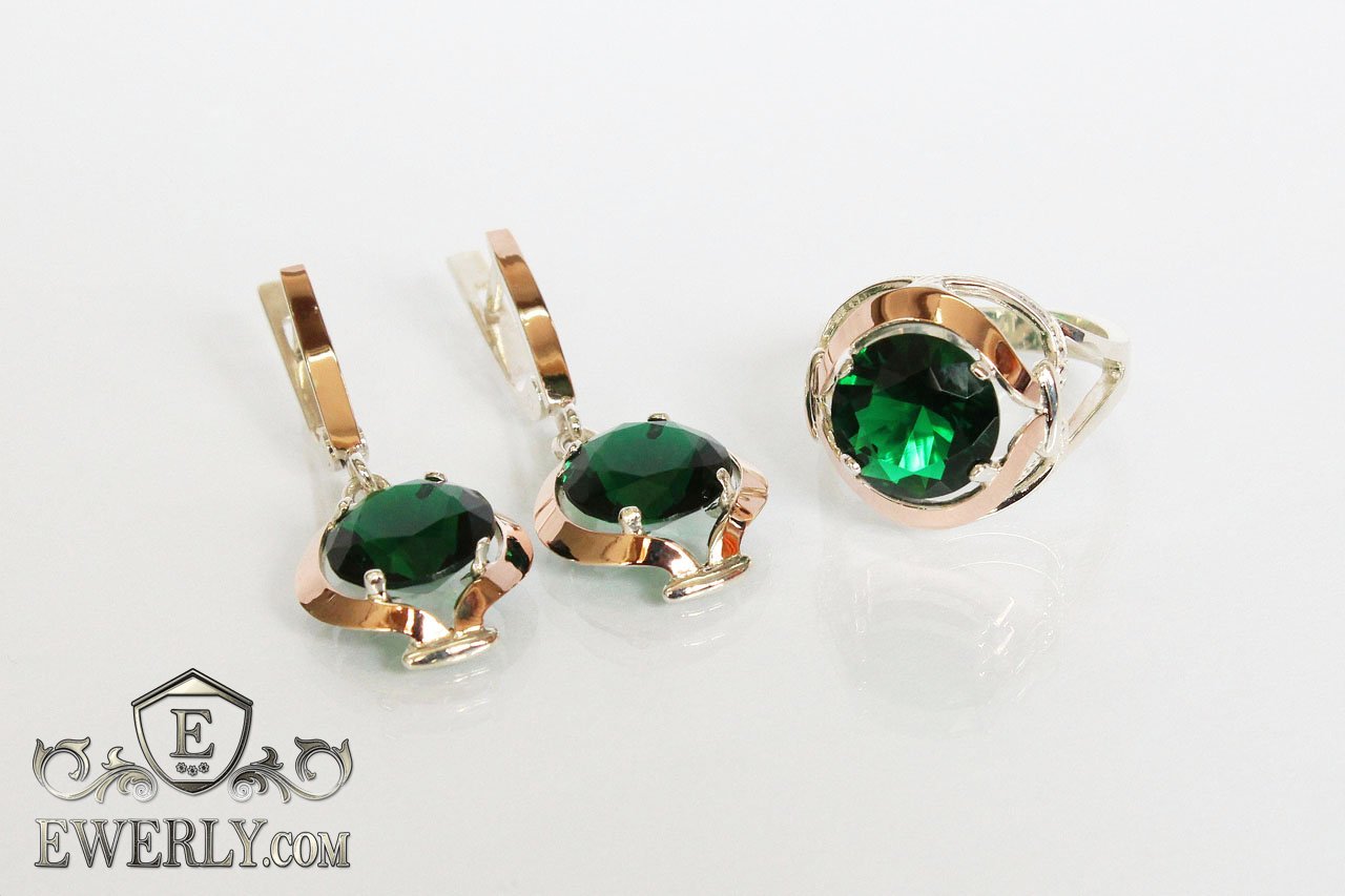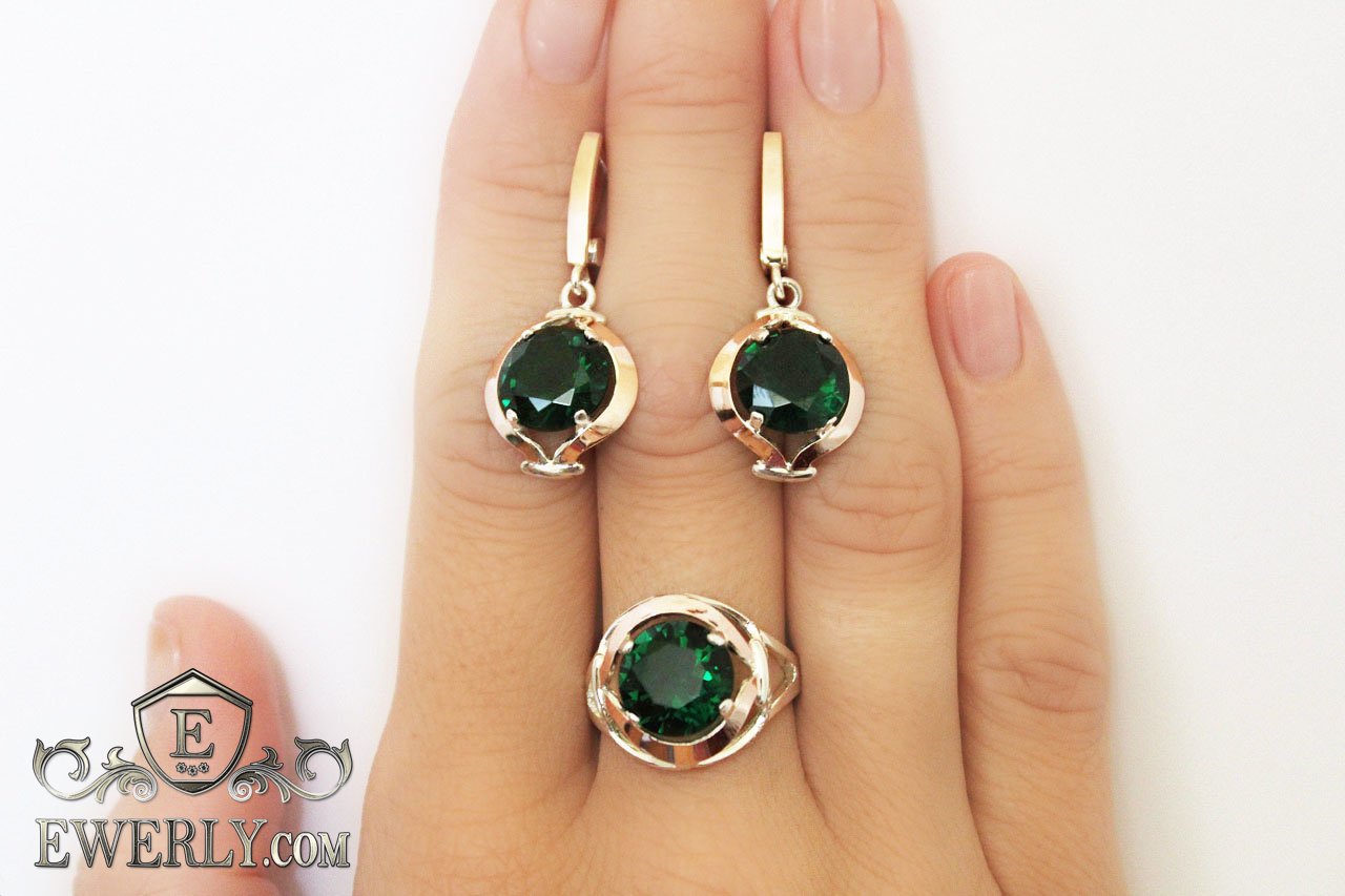 Жіночий комплект: срібний перстень і сережки з зеленими фіанітами