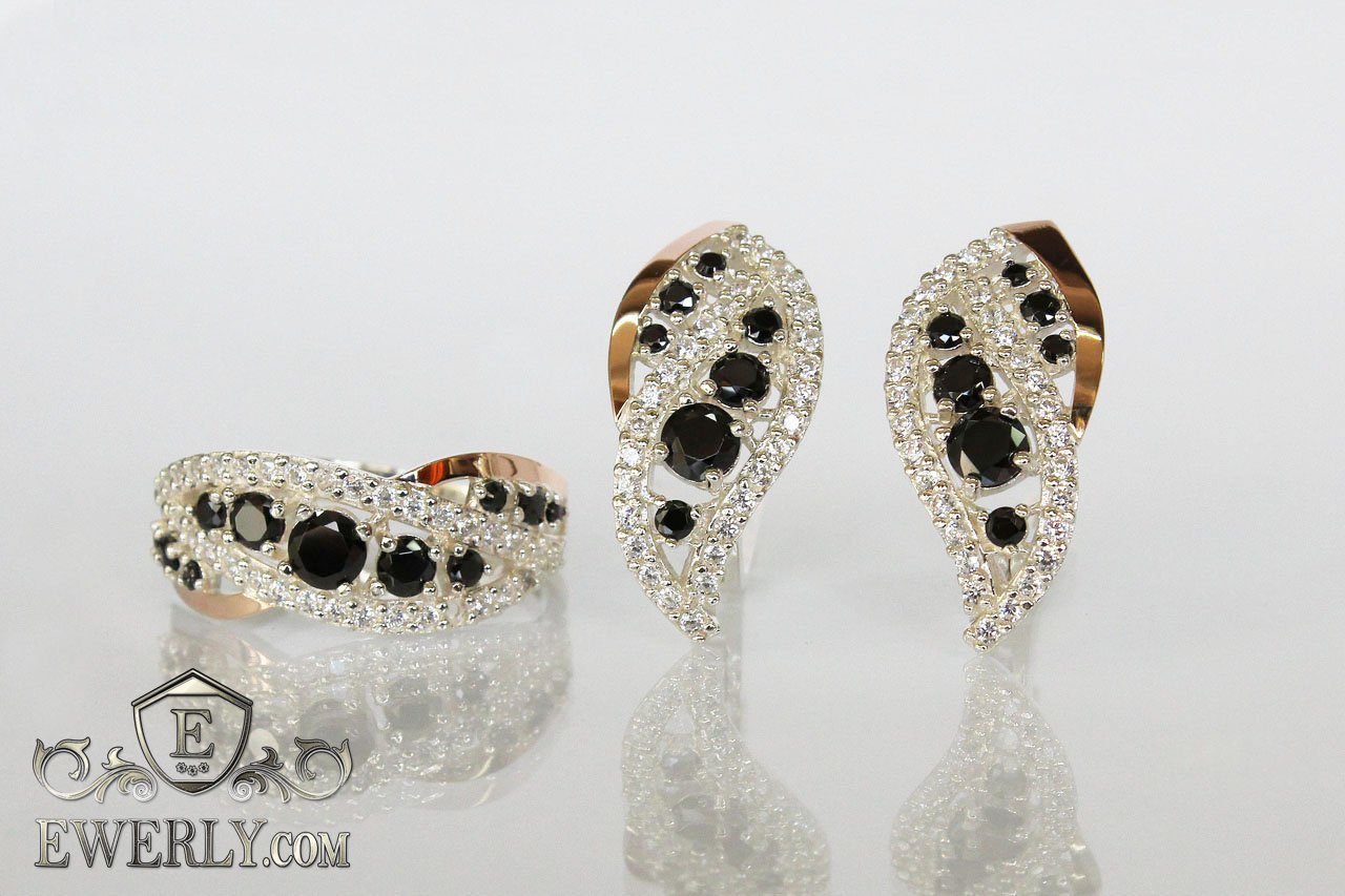 Жіночий набір: сережки і кільце зі срібла з золотом і чорними каменями