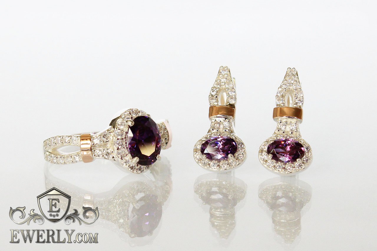 Жіночий набір: сережки і кільце зі срібла з золотом і камінням (колір-аметист)