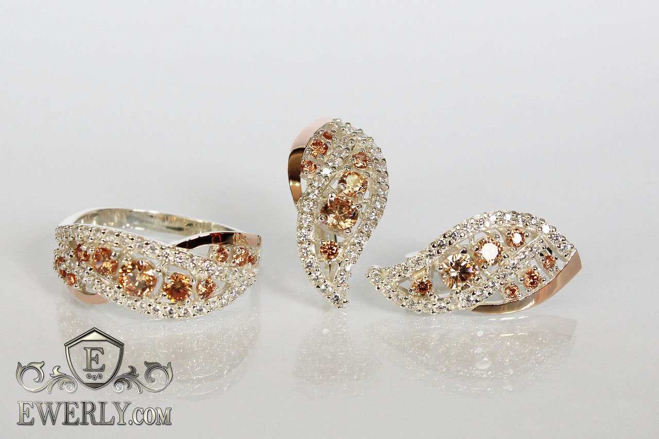 Жіночий набір: сережки і кільце зі срібла з золотом і камінням (колір-шампань)