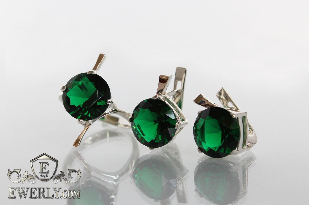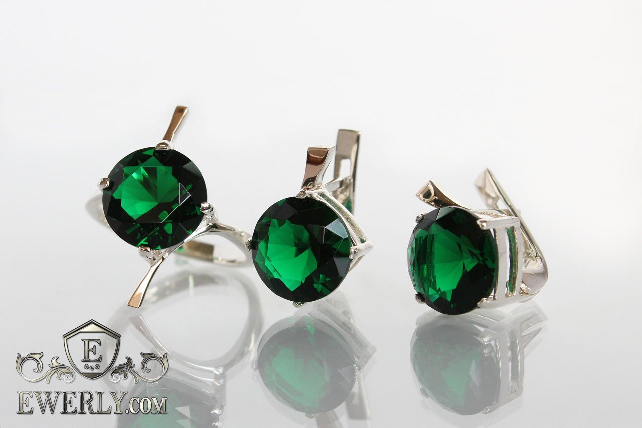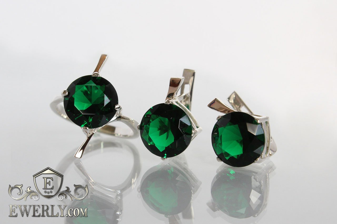 Жіночий набір: срібний перстень і сережки з зеленими каменями