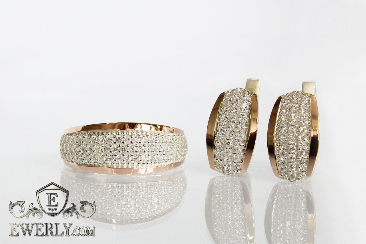 Жіночий комплект: сережки і кільце зі срібла з золотом і білими каменями
