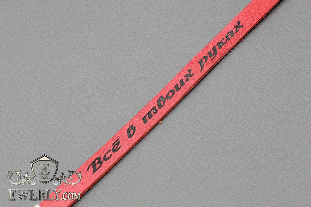 Напис на браслеті можна змінити за бажанням, а також і колір шкіри можна замовити інший - біла, чорна, коричнева, червона, фіолетова, синя, зелена.