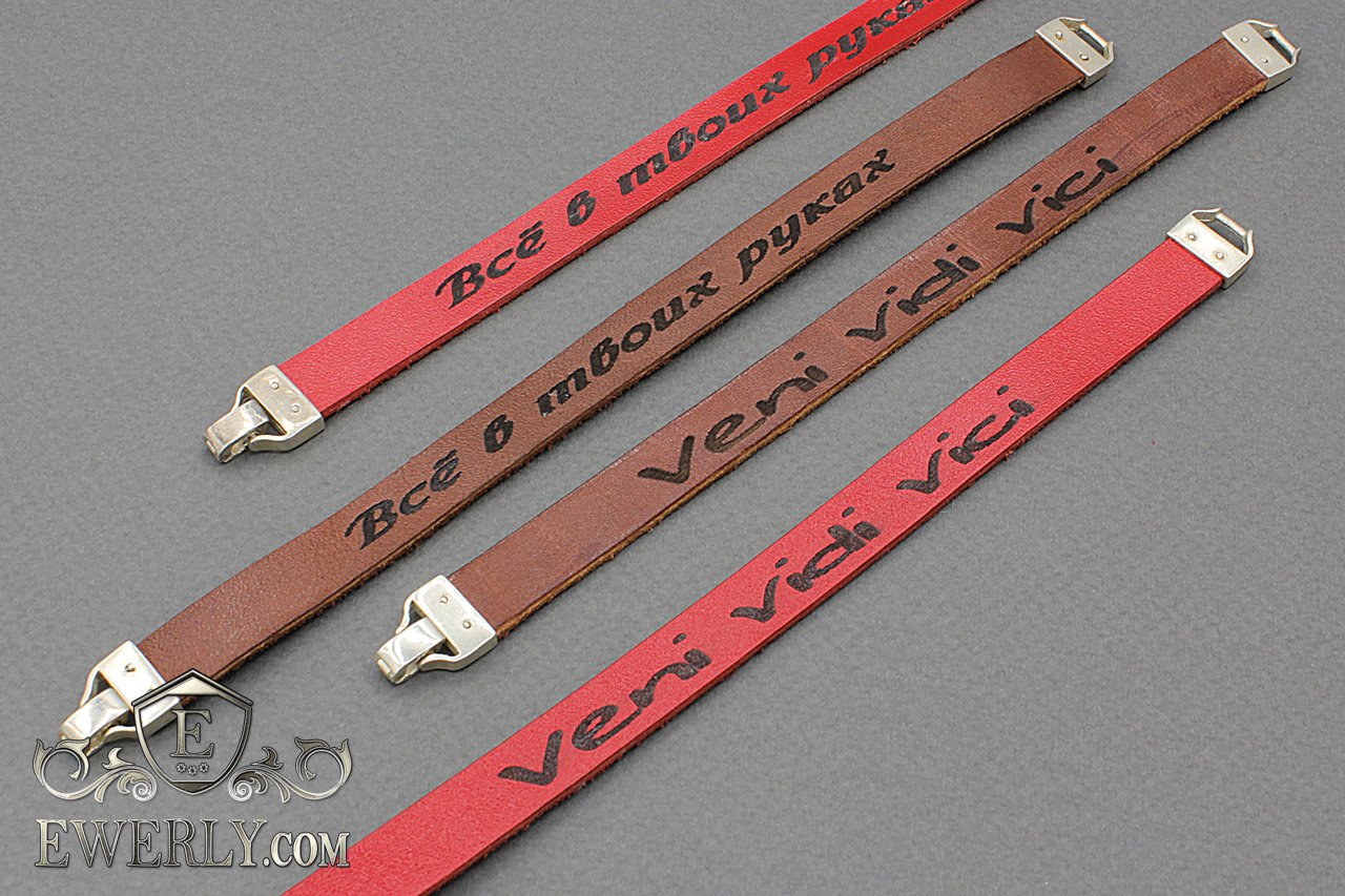 Напис на браслеті можна змінити за бажанням, а також і колір шкіри можна замовити інший - біла, чорна, коричнева, червона, фіолетова, синя, зелена.