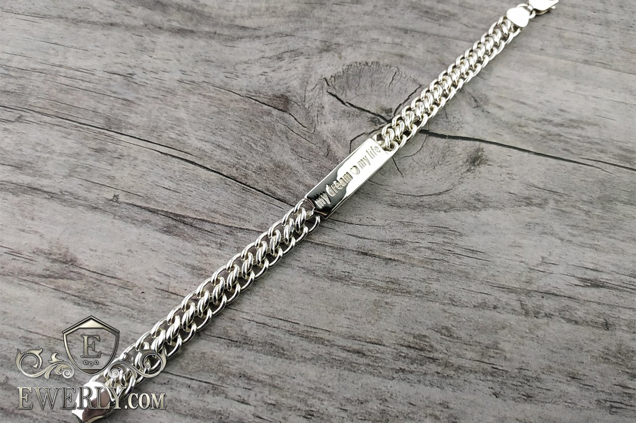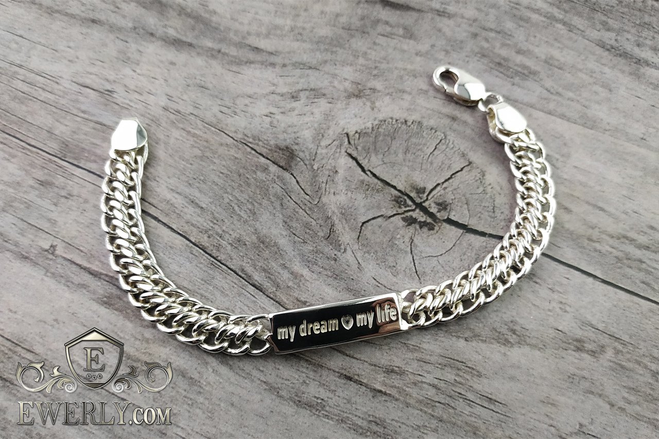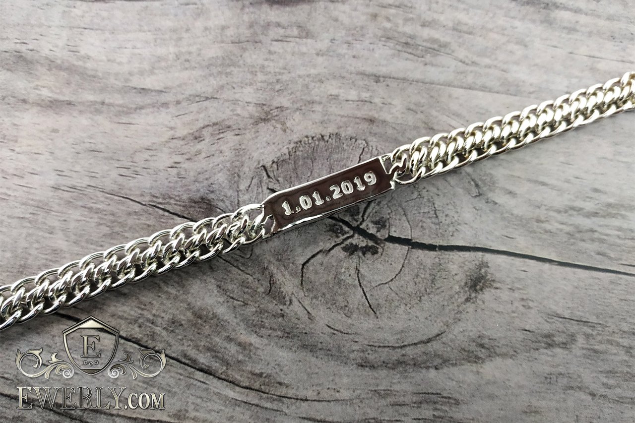 Повновісний браслет. На фото зображено Подвійний панцирний срібний браслет із пластиною, також плетіння має назву "Десятка". Дана пластина має довжину 3 см і гравіювання з двох сторін: знизу "1.01.2019" та зверху "my dream ❤ мy life".
