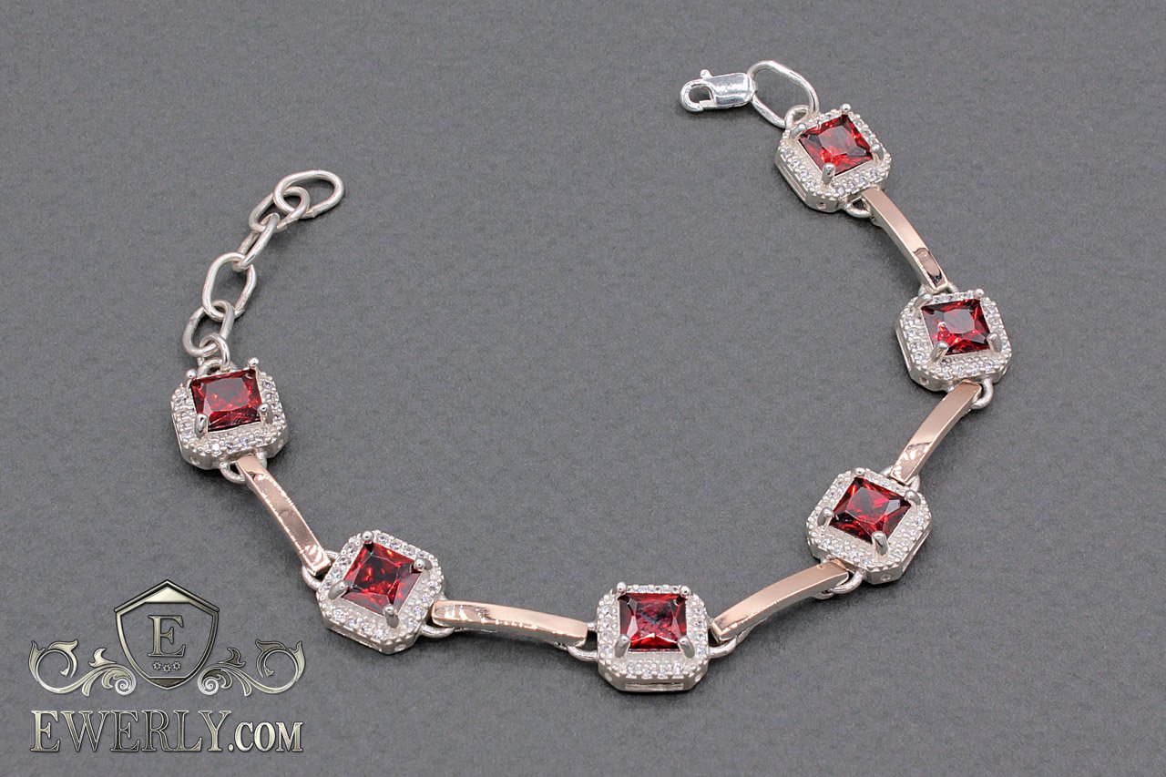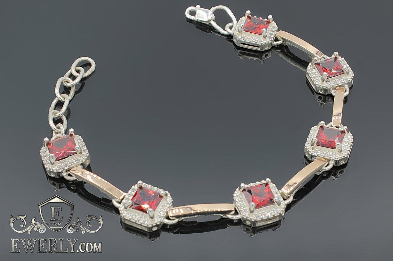 Жіночий срібний браслет з золотом і червоними каменями
