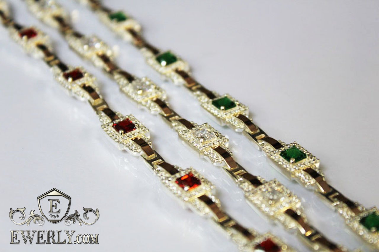 Повновісний браслет. Жіночий браслет зі срібла зі вставками золота і камінням (червоними фіанітами).
