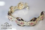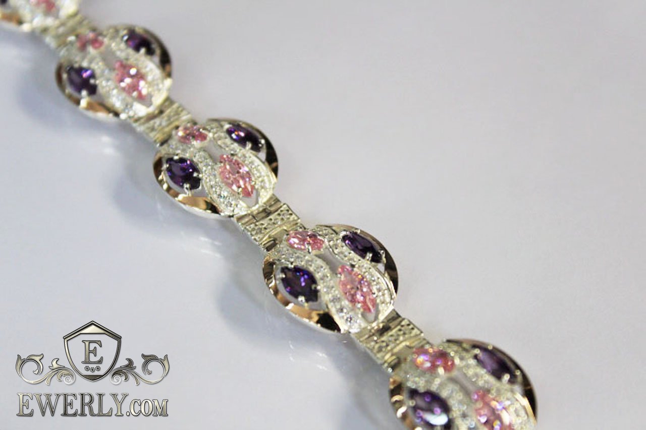 Повновісний браслет. Жіночий срібний браслет з фіанітамі рожевого, фіолетового і білого кольору і зі вставками золота.