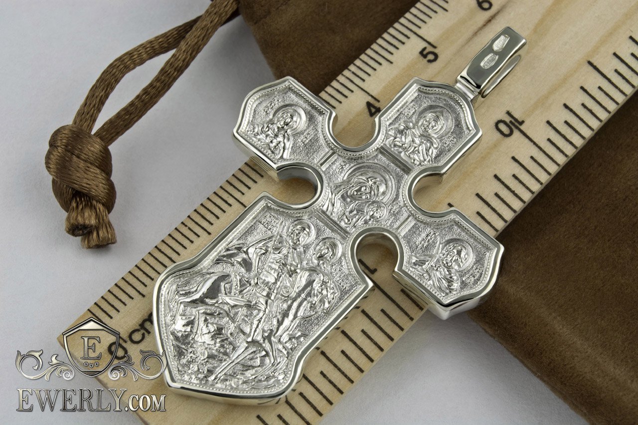 Великий срібний чоловічий хрест з розп'яттям. Казанська ікона Божої матері