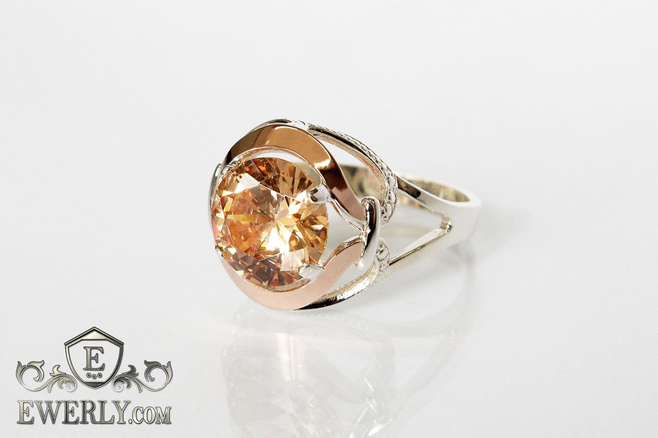 Кільце зі срібла з золотом і каменем кольору - шампань для жінки